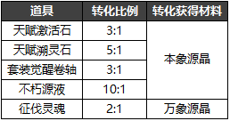 1、部分材料以一定比例结算为本象源晶/万象源晶,本象源晶可在S2赛季中锻造天赋洗练材料,万象源晶可在S2赛季中锻造天赋激活材料。可转换的材料及转换比例如下(典藏秘录抽取的天赋溯灵石除外):